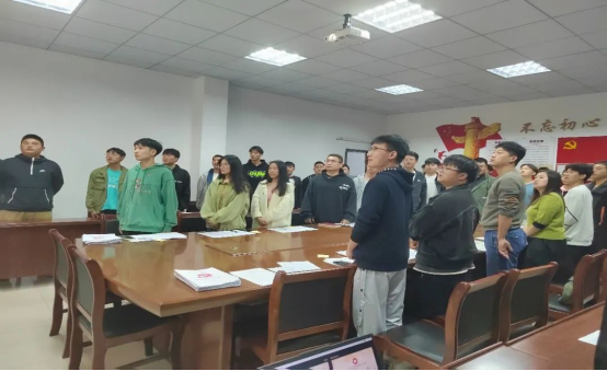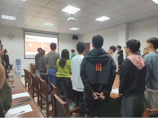主持人刘柯宏宣布答辩会开始,全体起立,奏唱国歌。发展对象答辩正式开始。