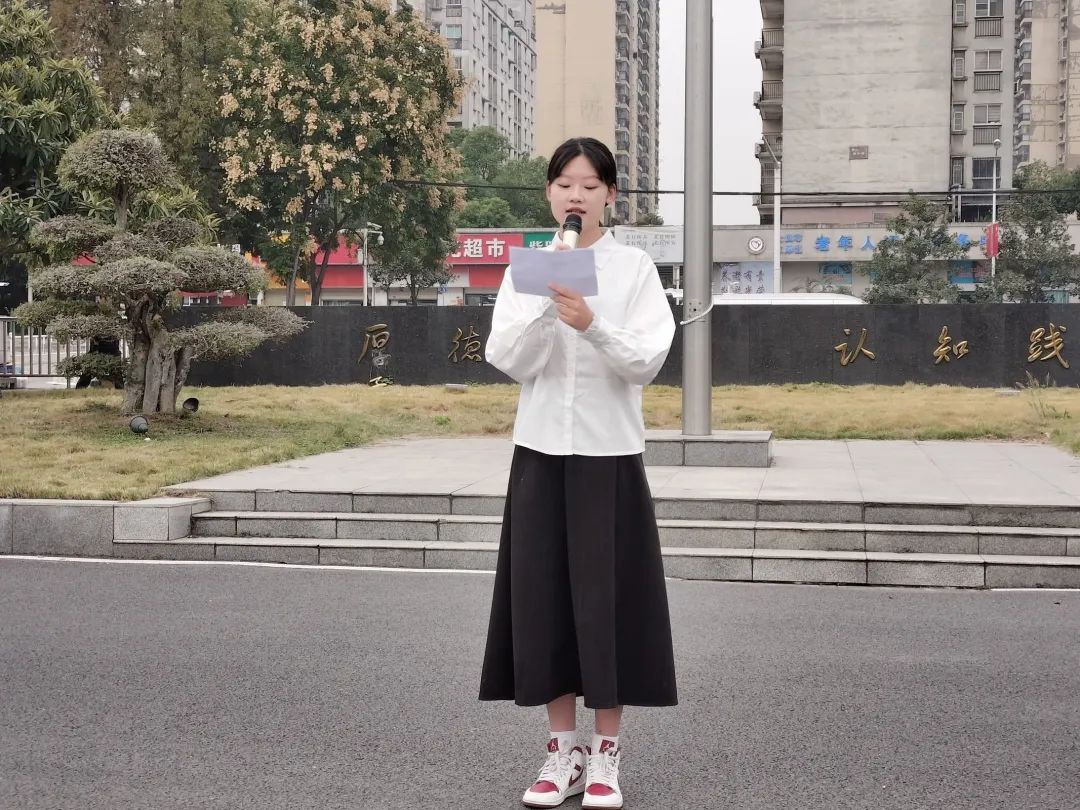 学生代表韩霄同学发表国旗下的演讲,他激昂的演讲让同学们回顾历史,展望未来,介绍了党的二十大召开的内容、意义和影响。他讲到:“我们相信,党的二十大的召开,将让中国人的心里更踏实,让中国迈出的步伐更稳健。”
