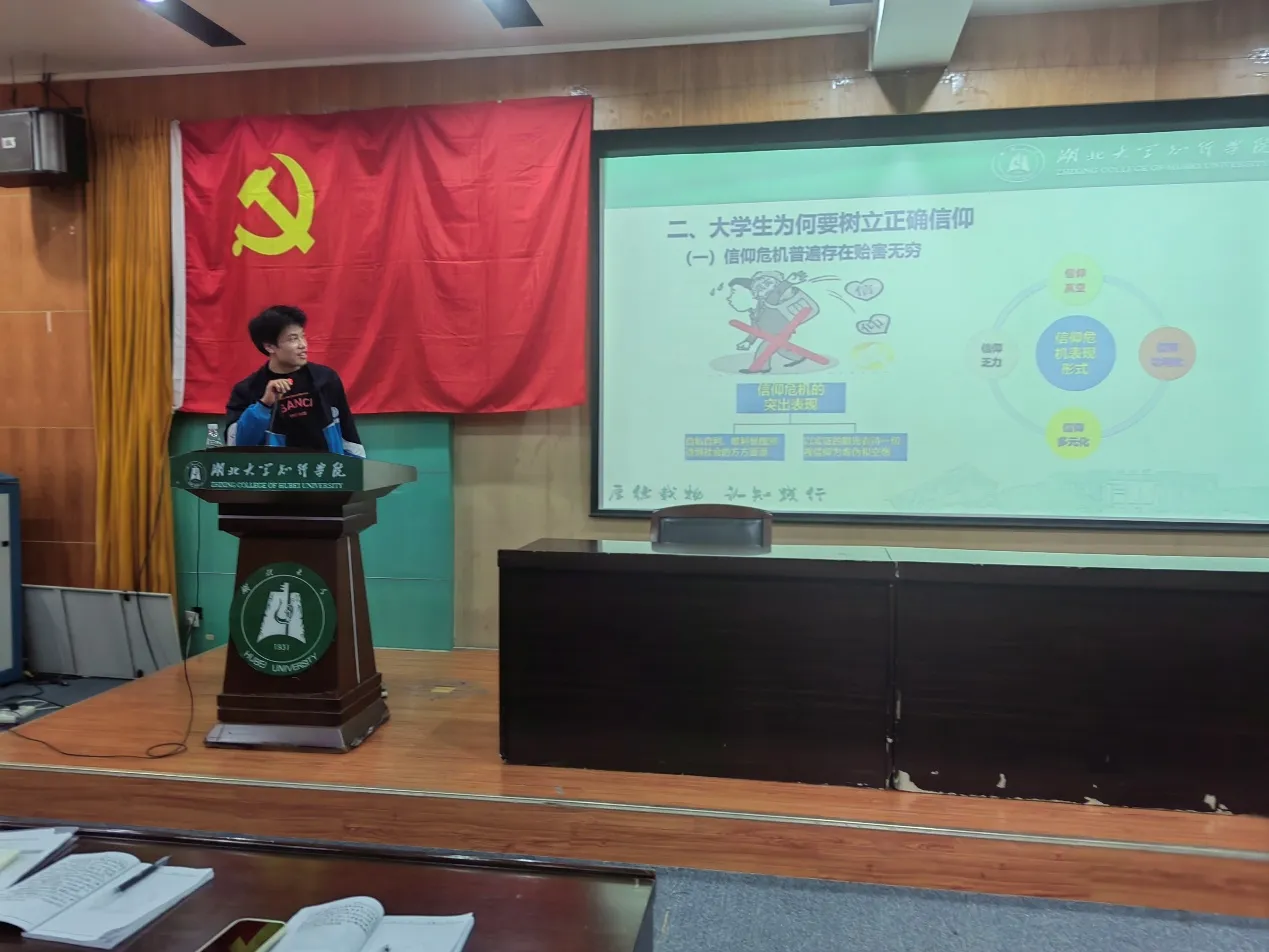 其次,高校长从“信仰危机普遍存在贻害无穷、正确信仰关系个人成长成才和正确信仰关系国家民族兴亡”三个方面解释大学生为何要树立正确信仰。高校长提问有没有同学愿意讲述自己对信仰危机的四种表现形式的理解,五位党校成员积极发言。