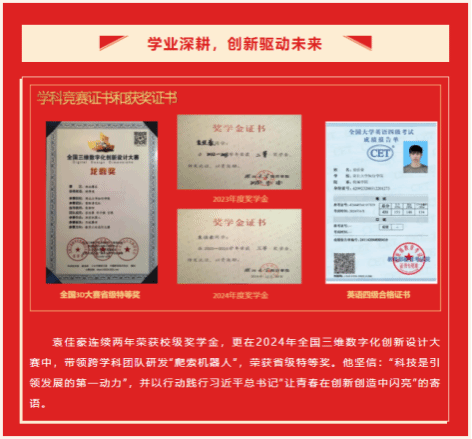 他就是机电2201班的袁佳豪,一名中共预备党员,也是同学们眼中的“三维成长榜样”。