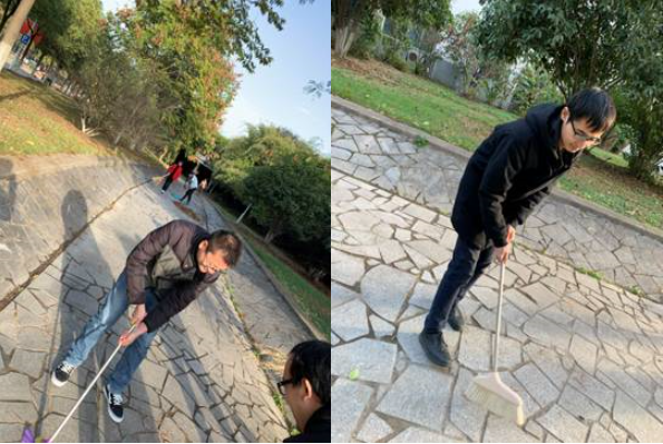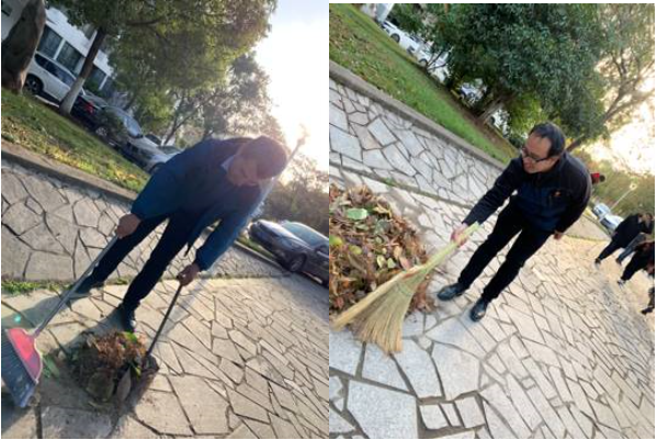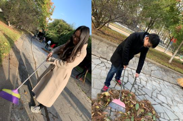 beat365中文官方网站党总支书记陈驰带领教工党支部及学生党支部全体成员进行校园清理工作,对校园知远楼环形路两边的飘枝落叶进行清理。