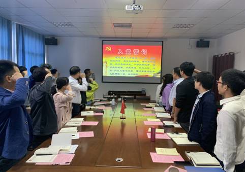 会议第三项,陈驰同志带领全体党员面向党旗重温入党誓词。