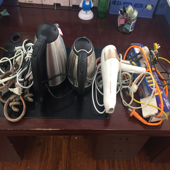 随着冬季的到来,很多学生喜欢在宿舍使用热得快、电磁炉、吹风机等功率较大的违规电器,这些大功率电器都会给宿舍电路安全带来沉重的负担,造成成严重的安全隐患,对学生的生命财产安全产生严重威胁。同时,对于违规接牵插线板的现象也进行了严格的排查,杜绝一切安全隐患的存在。