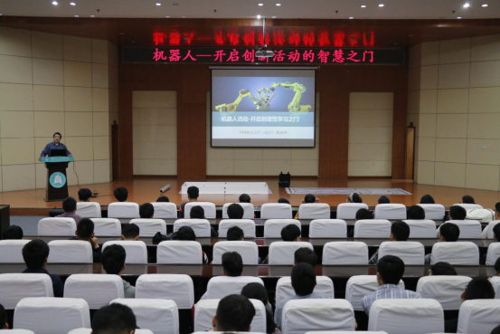 殷教授主要围绕机器人的典型应用、中国机器人大赛简介、机器人竞赛的直接效益、机器人竞赛的可实施性四个方面进行了讲解。这四个方面激起了同学们的兴趣和求知欲,深入简出的介绍了机器人的基本组成,指出机器人已经不是科幻,机器人时代已经来临,是人类真实的未来。当幻想与真实同步存在,我们当代大学生能否跟上时代的潮流?答案是肯定的,机器人的设计和制作并不是高不可测的。由于机器人是一个十分典型的机电一体化产品,在机器人的设计制作过程中,要求同学们具备相关专业知识。
