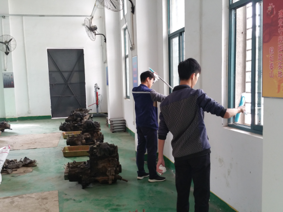 活动伊始,实训基地负责老师陈艳老师给同学们进行了分工安排,在各党小组负责人的带领下,同学们纷纷投入到打扫工作中,一部分学生负责打扫和清洗实训中心的地面和机械设备,另一部分学生戴上手套,拿上扫帚等工具负责清理实训中心周围的地面垃圾,大家热情饱满,不怕脏不怕累。尽管汗流浃背,但同学们依然干劲十足。在大家的共同努力下,经过一个多小时的清扫,第一、第二实训中心都被打扫得一尘不染,实训室内焕然一新。